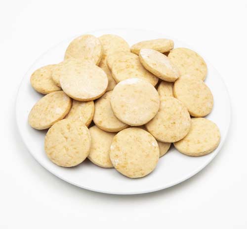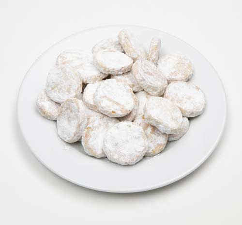 Tenda a massa em rolos com 2,5 a 3 centímetros de diâmetro e reserve no frigorífico durante uma hora. Depois de fria, corte em forma de bolachas e disponha-as num tabuleiro forrado com papel vegetal. Leve ao forno a 180ºC até ficarem douradas nas bordas. Depois de cozidas e frias, passe as bolachas pelos 100 gramas de açúcar em pó.