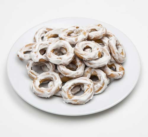 Entretanto, bata a clara de ovo com o açúcar em pó e o sumo de limão até ficar em merengue. Pincele as argolas com o merengue e coloque num tabuleiro forrado a papel vegetal. Deixe secar ao ar ou no forno a baixa temperatura.