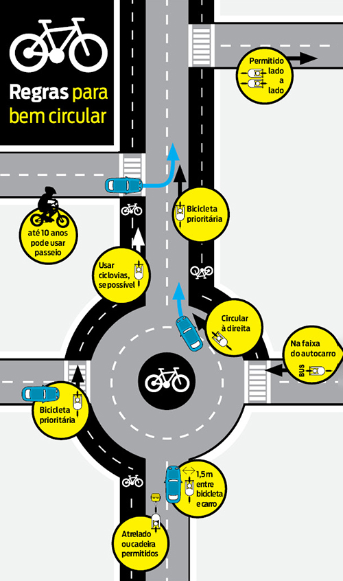 Na rotunda, os ciclistas podem ocupar a via de trânsito mais à direita, mas devem facilitar a saída dos condutores que circulam no interior da rotunda.
