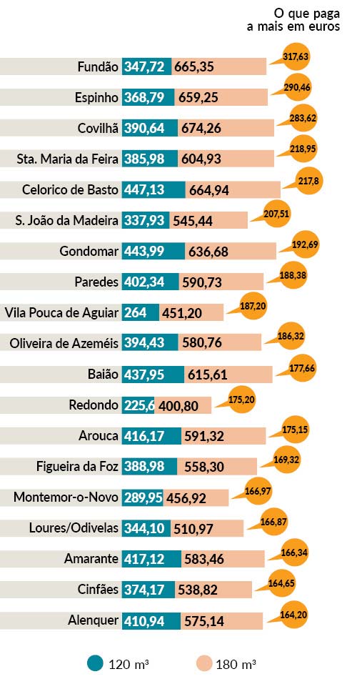 O preço a pagar a mais quando se excede o consumo de 120 m3 de água por ano (10 m3 por mês) e se atinge o patamar dos 180 m3 anuais (15 m3 por mês) dispara nalguns municípios. Contas feitas ao abastecimento, ao saneamento e aos resíduos, a autarquia do Fundão lidera na maior diferença: passa de 347,72 para 665,35 euros, desembolsando o consumidor mais 317,63 euros. Só no abastecimento, o salto é de 143,34 euros: de 183,15 para 326,49 euros. Logo a seguir, encontra-se Espinho, no distrito de Aveiro: a diferença da fatura global é de 290,46 euros (de 368,79 para 659,25 euros).