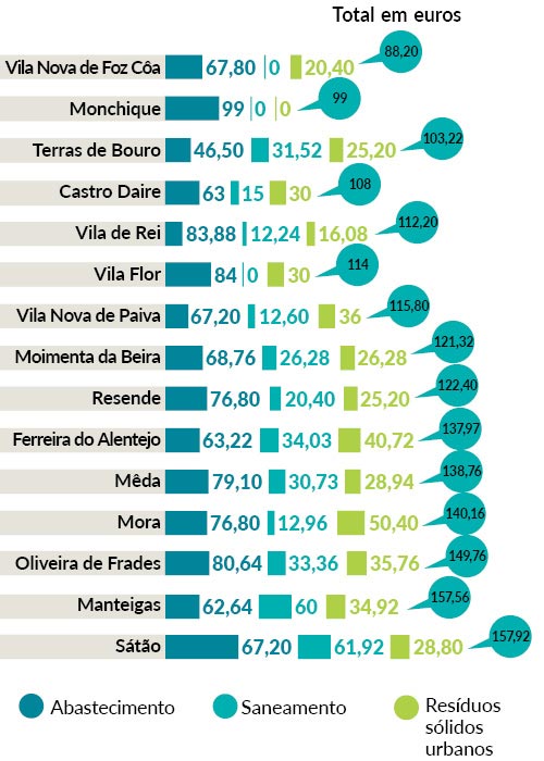Trofa, Santo Tirso e Vila do Conde, todos do distrito do Porto, cobram 241,37 (os dois primeiros) e 250,02 euros por ano, unicamente pelo abastecimento de 120 m3 de água. Se fizermos as contas à fatura total, e acrescentarmos o saneamento, no final do ano, acresce mais 166,24 euros em Trofa e Santo Tirso, e 154,41 euros, em Vila do Conde. E, ao somarmos os resíduos sólidos urbanos, cuja cobrança consta na fatura da água, acrescentam-se 96 euros (Trofa), 83,16 euros (Santo Tirso) e 75,78 euros (Vila do Conde). Ou seja, um total de mais de 500 euros anuais, no primeiro município, e próximo desse valor, nos outros dois. Concluindo, residir nos 15 municípios mais caros implica pagar por ano, no mínimo, 391 euros.