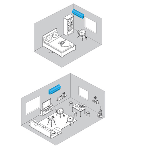 Por exemplo, para uma sala entre 20 e 35 metros quadrados, a potência deve ser entre 9000 e 13500 BTU. Para uma sala de cerca de 50 metros quadrados, que recebe muita luz solar e tem várias janelas, precisaríamos de um aparelho de ar condicionado mais próximo de 19000 BTU. Já para salas de 70 metros quadrados ou mais, além de instalar um aparelho com a potência necessária (para salas deste tamanho, são vendidos aparelhos de cerca de 24000 BTU), é recomendável instalar mais do que uma unidade ou distribuir o ar através de condutas em diferentes pontos da sala, melhorando assim o fluxo de ar. De igual forma, deverá também ter em atenção a capacidade do equipamento para aquecimento. Contudo, lembramos que estes valores são apenas indicativos, uma vez que podem existir outros fatores que condicionem esta capacidade. O ideal é que recorra a um técnico especializado para avaliar as suas divisões e indicar qual a melhor solução para as suas necessidades.