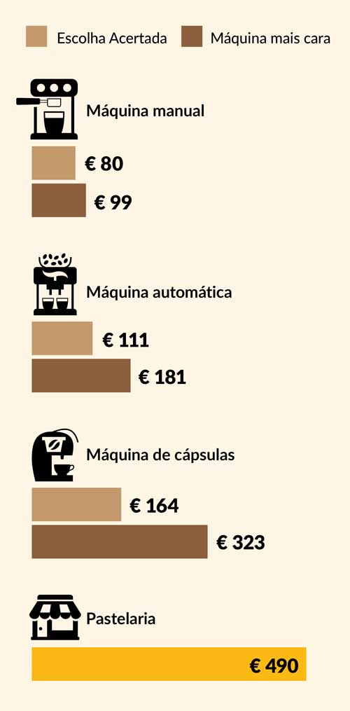 A grande vantagem das tradicionais máquinas de cachimbo é o custo de utilização anual: se optar pelas nossas Escolhas Acertadas, e tendo em conta o custo de aquisição do aparelho, o consumo de dois cafés por dia e a amortização da máquina durante dois anos, gastará 80 euros por ano se optar por uma máquina manual, 111 euros se optar por uma máquina automática e 164 euros se escolher uma máquina de cápsulas. Se for beber o café à pastelaria, prepare-se para gastar 490 euros por ano.