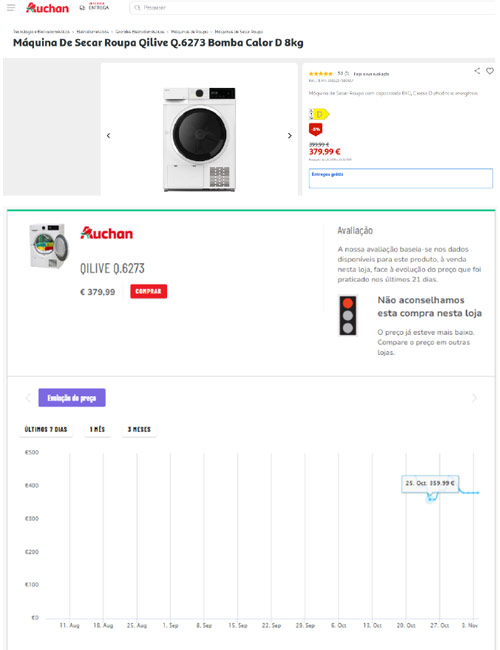 Quando, a 4 de novembro, a DECO PROteste visitou a loja online da Auchan — que lançou a sua campanha de Black Friday no início do mês —, a máquina de secar roupa Qilive Q.6273 Bomba Calor D 8 kg estava a ser vendida por 379,99 euros. Contudo, apenas dias antes, a 25 e a 26 de outubro, este eletrodoméstico estava à venda na mesma loja por menos 20 euros, a 359,99 euros. Quem a comprasse na campanha de Black Friday não obtinha um verdadeiro desconto.