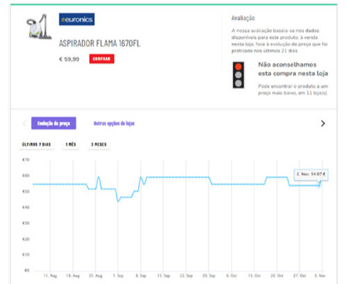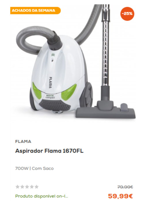 Já na campanha "Achados da Semana", que decorreu na loja online Euronics de 3 a 9 de novembro, o aspirador Flama 1670FL estava a ser vendido por 59,99 euros, quando apenas um dia antes tinha estado à venda por um preço mais baixo, a 54,07 euros.