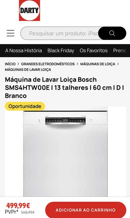 A "oportunidade" anunciada na máquina de lavar loiça Bosch SMS4HTW00E, à venda na loja online da Darty, é um exemplo de como é importante estar atento aos preços praticados nesta época do ano.
