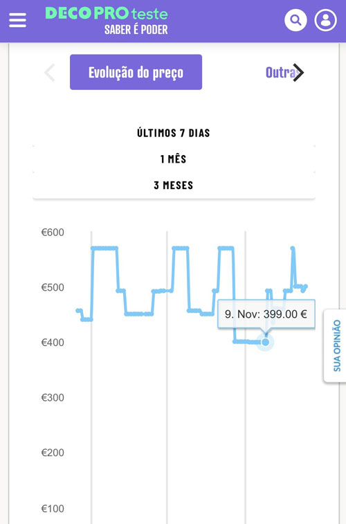 A ferramenta Comparar Preços regista a evolução dos preços dos produtos nas lojas online e permite saber se está mesmo perante um desconto. Basta inserir o nome da loja e de um produto ou o URL da página onde este está a ser vendido no motor de pesquisa e, se estiver na base de dados da DECO PROteste, o comparador indica se é mesmo uma boa compra nessa loja, em que lojas está à venda mais barato e quais os preços do produto nos últimos sete dias, no último mês e nos últimos três meses.
