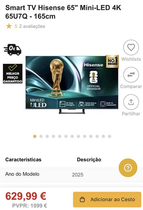 A 24 de novembro, quando a DECO PROteste visitou a loja online da FNAC, a smart TV Hisense 65" Mini-LED 4K 65U7Q - 165cm estava a ser vendida por 629,99 euros, no âmbito da campanha de Black Friday “Melhor preço garantido", que decorre de 28 de outubro a 3 de dezembro.