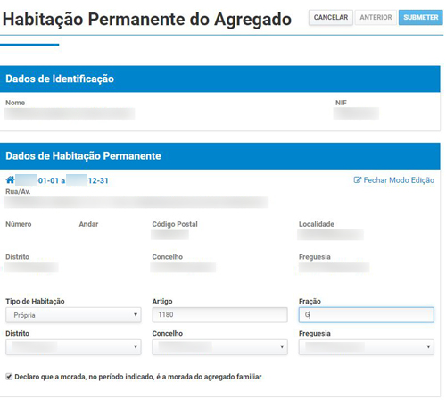 Abra o modo de edição para identificar o imóvel com o tipo (habitação própria ou arrendamento), o artigo, a fração e a localização.