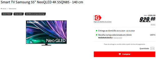 Na campanha de black friday da Media Markt, a decorrer desde 29 de outubro, a loja online não anuncia de forma direta a realização de descontos, mas compara os atuais preços de venda com um PVPR. Esta forma de comparação de preços pode levar o consumidor a pensar que está perante uma grande promoção quando pode até nem obter nenhuma vantagem real com aquela compra. É o caso da smart TV Samsung 55" NeoQLED 4K 55QN85.