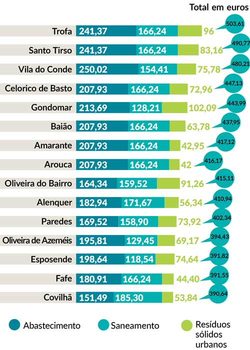 Trofa, Santo Tirso e Vila do Conde, todos do distrito do Porto, cobram 241,37 (os dois primeiros) e 250,02 euros por ano, unicamente pelo abastecimento de 120 m3 de água. Se fizermos as contas à fatura total, e acrescentarmos o saneamento, no final do ano, acresce mais 166,24 euros em Trofa e Santo Tirso, e 154,41 euros, em Vila do Conde. E, ao somarmos os resíduos sólidos urbanos, cuja cobrança consta na fatura da água, acrescentam-se 96 euros (Trofa), 83,16 euros (Santo Tirso) e 75,78 euros (Vila do Conde). Ou seja, um total de mais de 500 euros anuais, no primeiro município, e próximo desse valor, nos outros dois. Concluindo, residir nos 15 municípios mais caros implica pagar por ano, no mínimo, 391 euros.