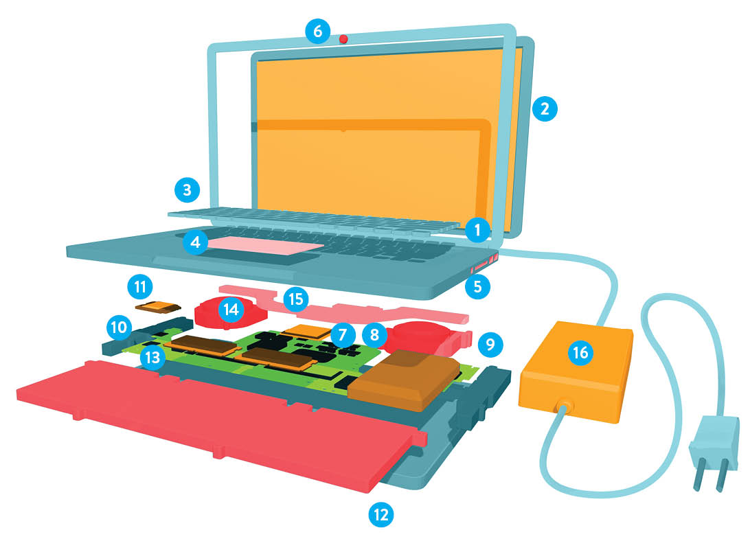 Os principais componentes internos, como o processador (7), a placa gráfica (8), o armazenamento (9), a memória RAM (10), a placa de rede (11) e a bateria (12) estão localizados na placa-mãe (13) e são arrefecidos por ventoinhas (14) e dissipadores térmicos, em cobre (15).