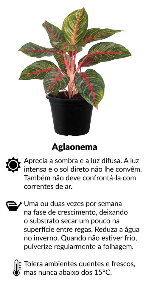 O tamanho, a forma das folhas e a frondosa folhagem da aglaonema (Aglaonema spp.) são fascinantes. Por ser resistente e de fácil manutenção, faz parte das plantas de interior recomendadas para pessoas que não se consideram particularmente dotadas para a jardinagem. Alguns estudos realizados em ambiente laboratorial parecem revelar que, por ter folhas grandes, a aglaonema é particularmente eficaz na absorção do formaldeído e do benzeno, aumentando este efeito à medida que a planta cresce. Esta fama – não comprovada em meio "real" – não dispensa a necessidade de arejar regularmente a divisão. A grande vantagem de escolher a aglaonema passa por ser uma planta muito decorativa fácil de cuidar e por não requerer muita luz para se manter bonita.