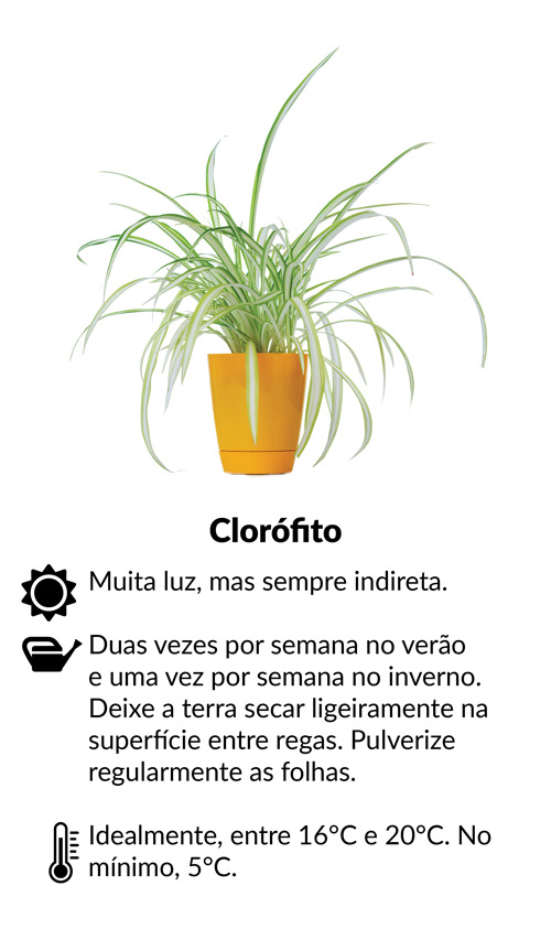 Extremamente fácil de cultivar, o clorófito (Chlorophytum comosum) é conhecido por oxigenar o ar interior e por absorver os principais poluentes domésticos, como o monóxido de carbono, o xileno e o formaldeído. Por não haver dados que comprovem esse efeito, mantenha sempre a casa arejada. Para uma planta mais bonita, pulverize regularmente as folhas e/ou instale a planta numa divisão húmida, como uma cozinha ou uma casa de banho.