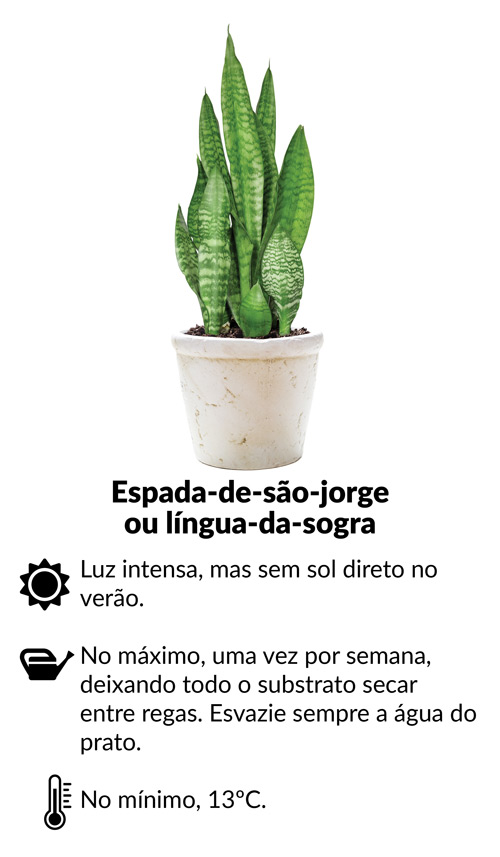 Para continuar, deve entrar no site ou criar uma conta .Apesar de o seu efeito "purificador do ar" ser limitado ou nulo, a Sansevieria trifasciata, conhecida como espada-de-são-jorge ou língua-da-sogra, tem granjeado fãs entre os jovens com gosto por interiores contemporâneos e por uma decoração moderna e faz parte do grupo de plantas consideradas despoluidoras. A grande vantagem desta opção para dar vida à sua casa é que se trata de uma planta de fácil manutenção: muito resistente, gosta de calor (desde que não esteja exposta ao sol direto) e não se deixa abater por diferenças de temperatura quando é colocada junto a radiadores ou na penumbra (apesar de precisar de muita luz para prosperar), nem por falta de água.