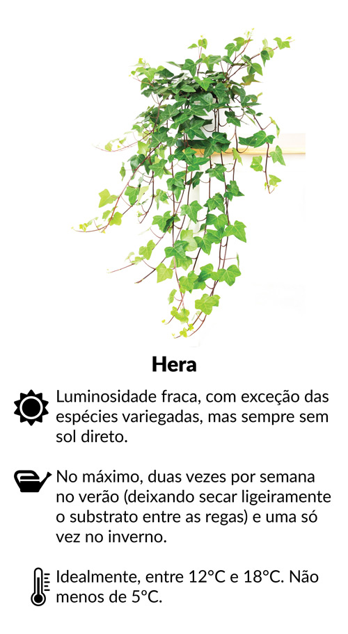 Também a hera (Hedera helix) é muitas vezes citada por ser uma planta alegadamente despoluidora. Mas não é nem mais nem menos "purificadora" do que a maioria das plantas de interior. A sua grande vantagem reside em ser fácil de tratar, vigorosa (cresce depressa), incrivelmente resistente e flexível (pode ser podada a gosto), além de ter uma irresistível folhagem delicada, que pode ser verde-lisa ou variegada e muitas vezes pendente.