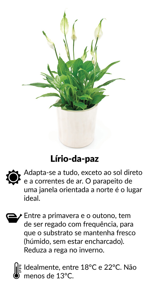 O lírio-da-paz (Spathiphyllum spp.) é uma planta de fácil manutenção e robusta, que pode dar flores todo o ano. Tira partido da fama de absorver o formaldeído, o benzeno, o amoníaco e o chileno, mas, como se trata de efeitos não comprovados, tê-la não dispensa, de modo algum, a necessidade de arejar a casa.