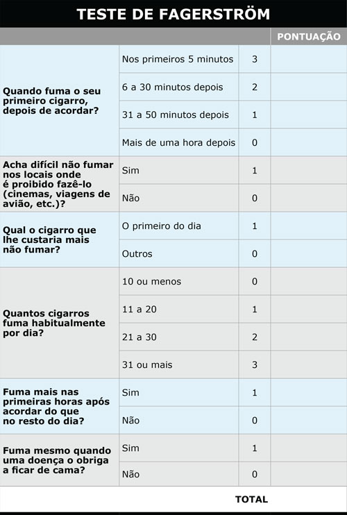 Responda às questões e aponte a pontuação correspondente para aferir o seu nível de dependência.