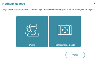 1. Depois de clicar em “Portal RAM – Registo de reações adversas a medicamentos” e selecionar a opção "Utente", tem de assinalar a opção que respeita à origem às reações adversas que vai descrever.