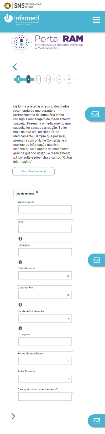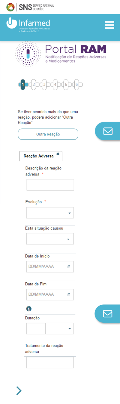 3. Nesta fase, deve descrever a reação causada pelo medicamento. Pode adicionar quantas quiser. Para poder continuar, tem de preencher a evolução da reação adversa. Para avançar, carregue na seta da barra superior (se estiver a preencher a partir de um computador) ou na seta final (se estiver a preencher através de um smartphone ou de um tablet).