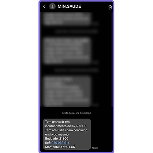 Recebeu uma mensagem em nome do Ministério da Saúde para efetuar um pagamento, com a referência multibanco 21800? Não pague e não clique no link que a mensagem contém. É fraude, e o único objetivo é extorquir dinheiro.